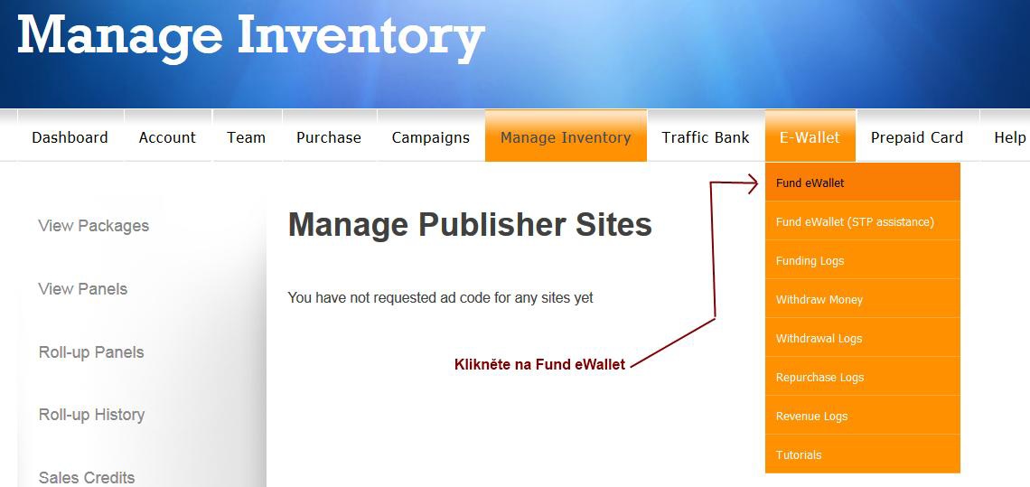 2) Přejděte na záložku „E-Wallet - Fund eWallet“