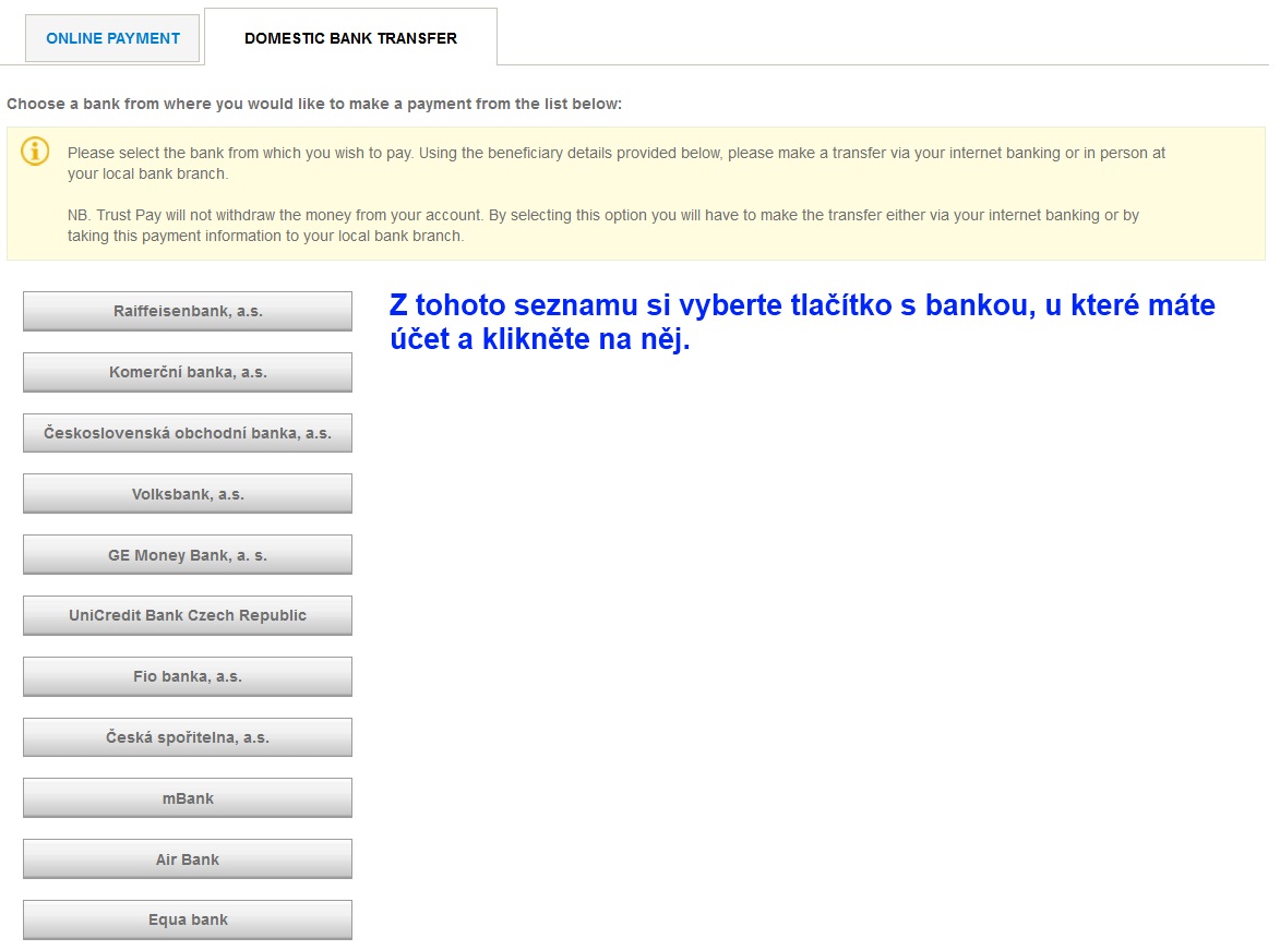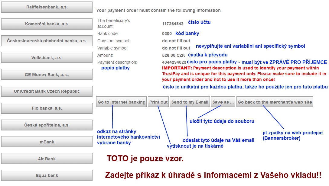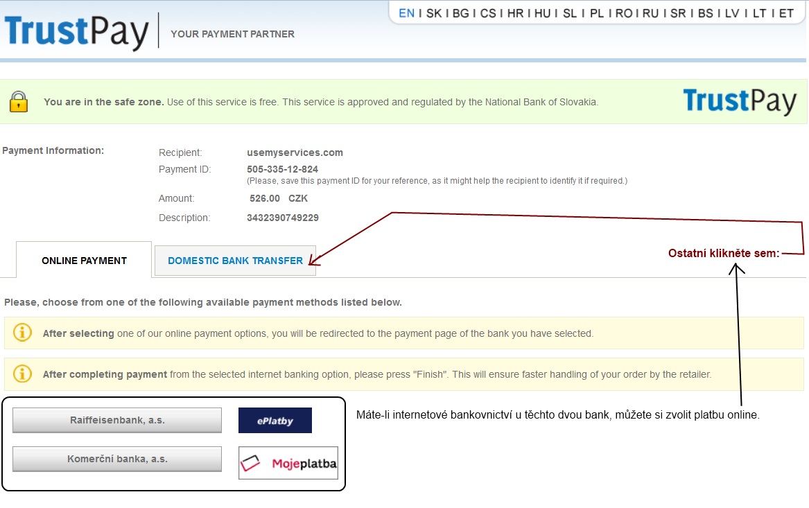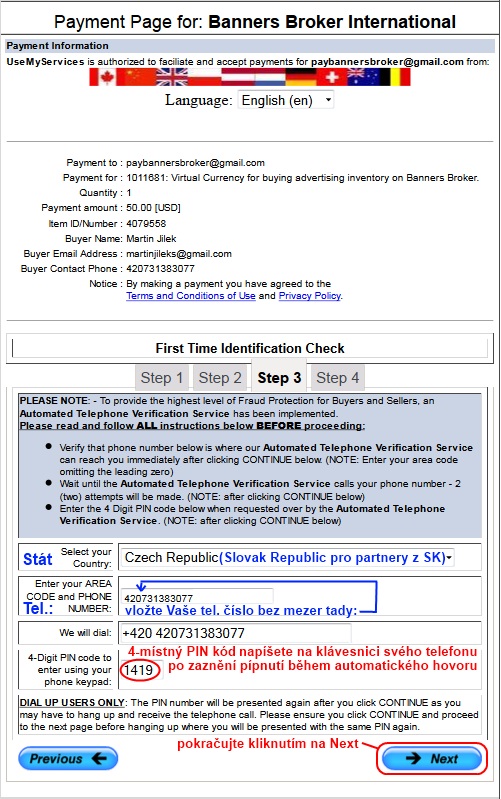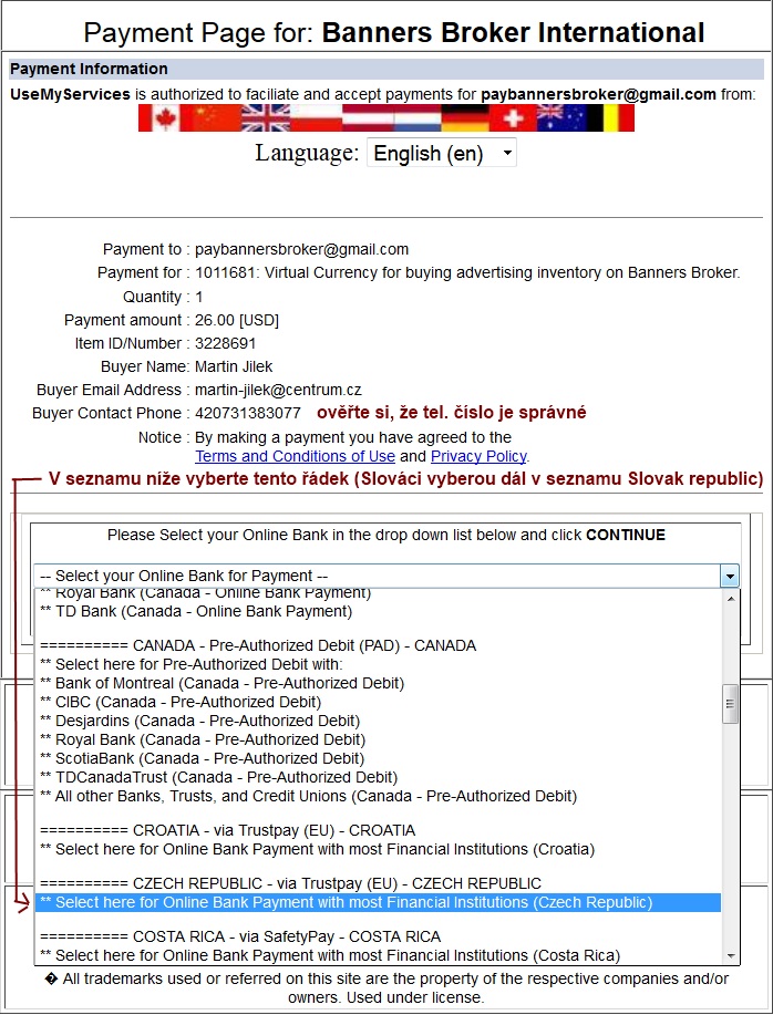 9) Na této stránce je třeba vybrat, že provádíte platbu z banky v ČR (SR) a zkontrolujte si správnost uvedení tel. čísla: