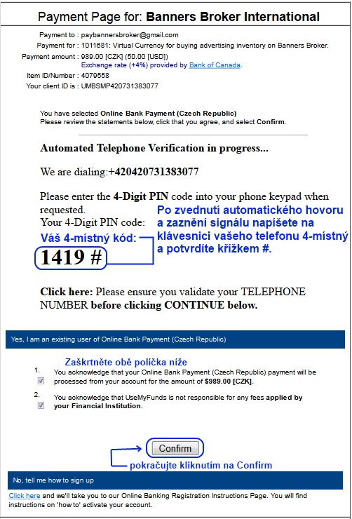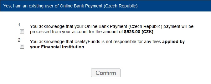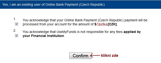 je třeba zaškrtnout obě políčka (souhlas s platbou z účtu a s tím, že „UseMyFunds“ není zodpovědná za výši poplatků v bance, kde máte účet (běžný příkaz k převodu)).