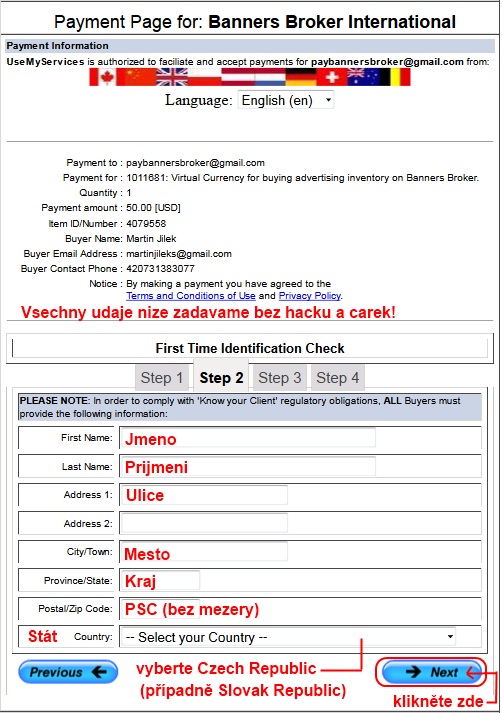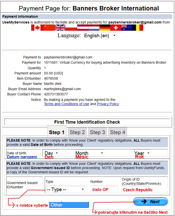 5) Pokud vkládáte přes UseMyFunds poprvé (nebo jste pro doménu usemyfunds.usemyservices.com vymazali v prohlížeči cookies), je třeba provést kontrolu identifikace. Do následujícího formuláře vložte Vaše datum narození, typ dokladu: Other, pak číslo OP a do posledního pole Czech Republic.
